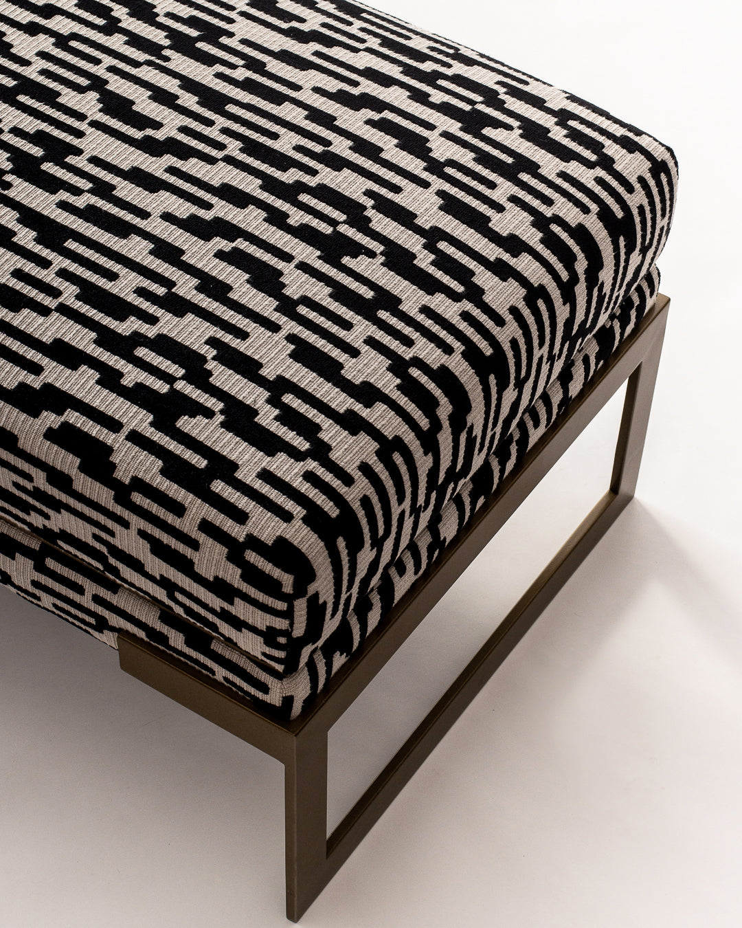 Su tapizado en blanco y negro aporta dinamismo visual, mientras que sus patas metálicas doradas elevan el diseño con un guiño de glamour sutil.