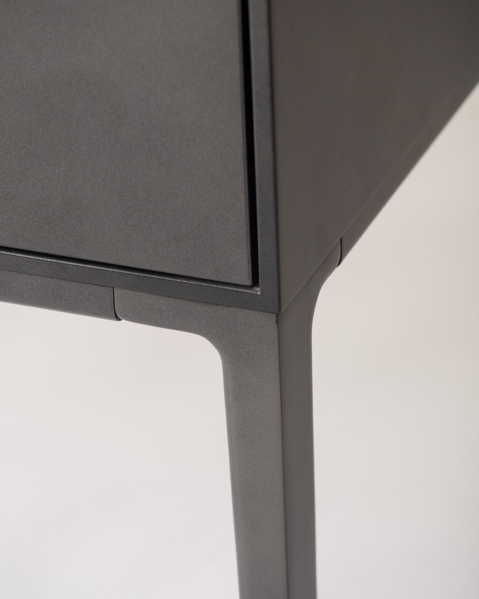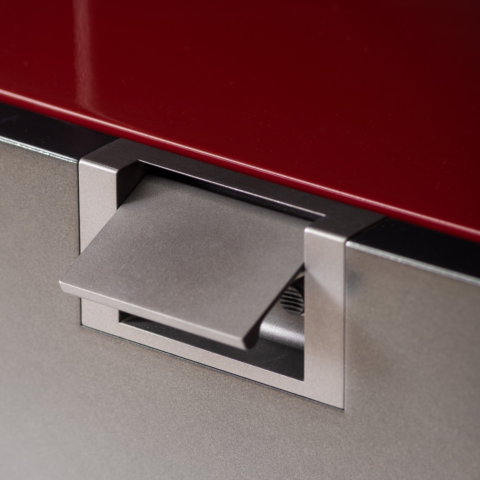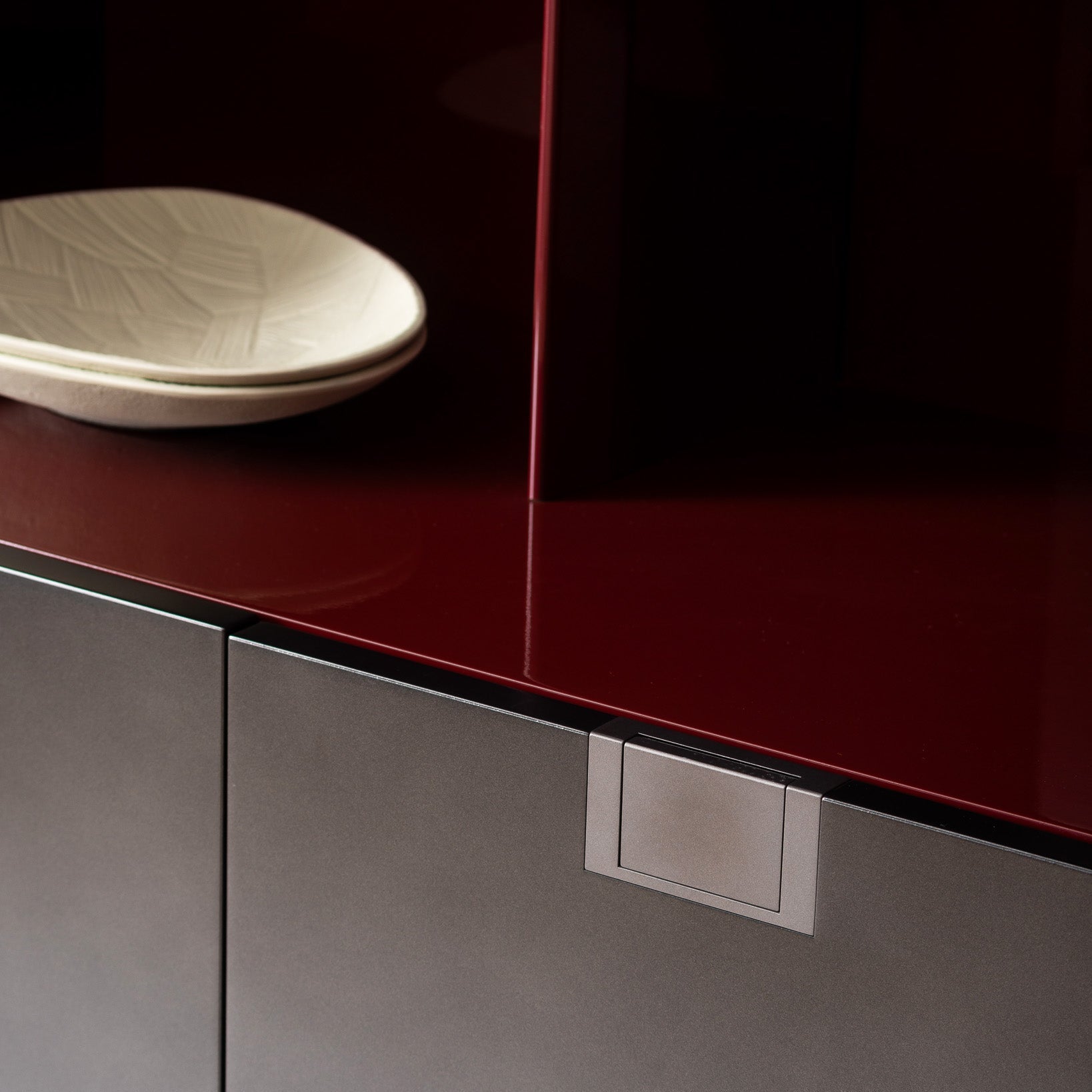 El Bar Alcor tiene una estructura lacada en negro efecto goma, interior guinda brillante, con un tirador retráctil muy elegante y pies finos que estilizan toda la estructura.