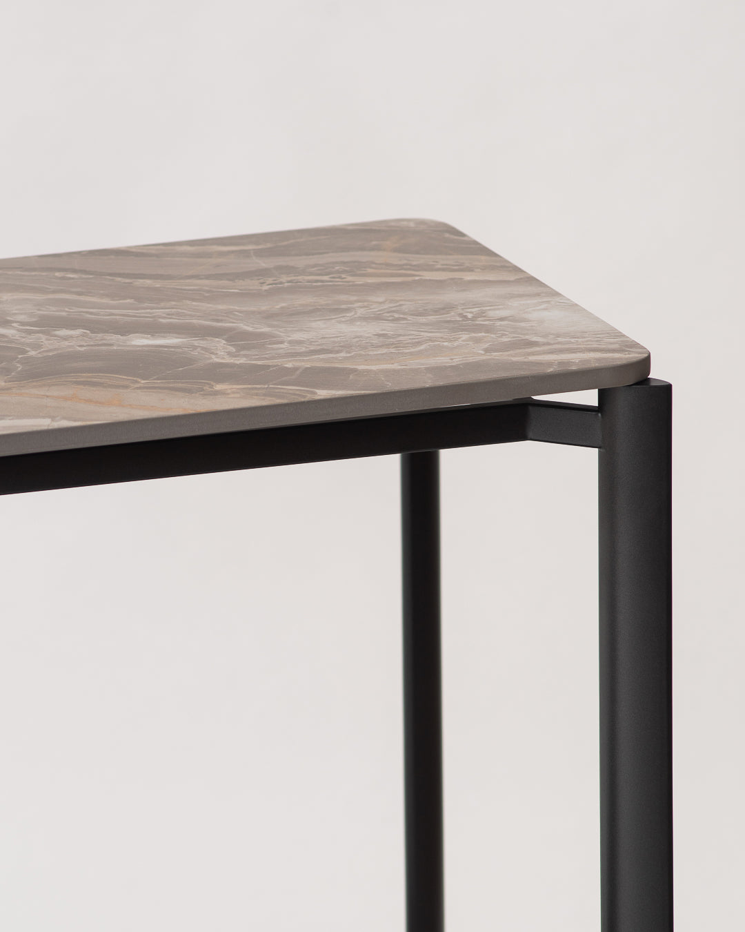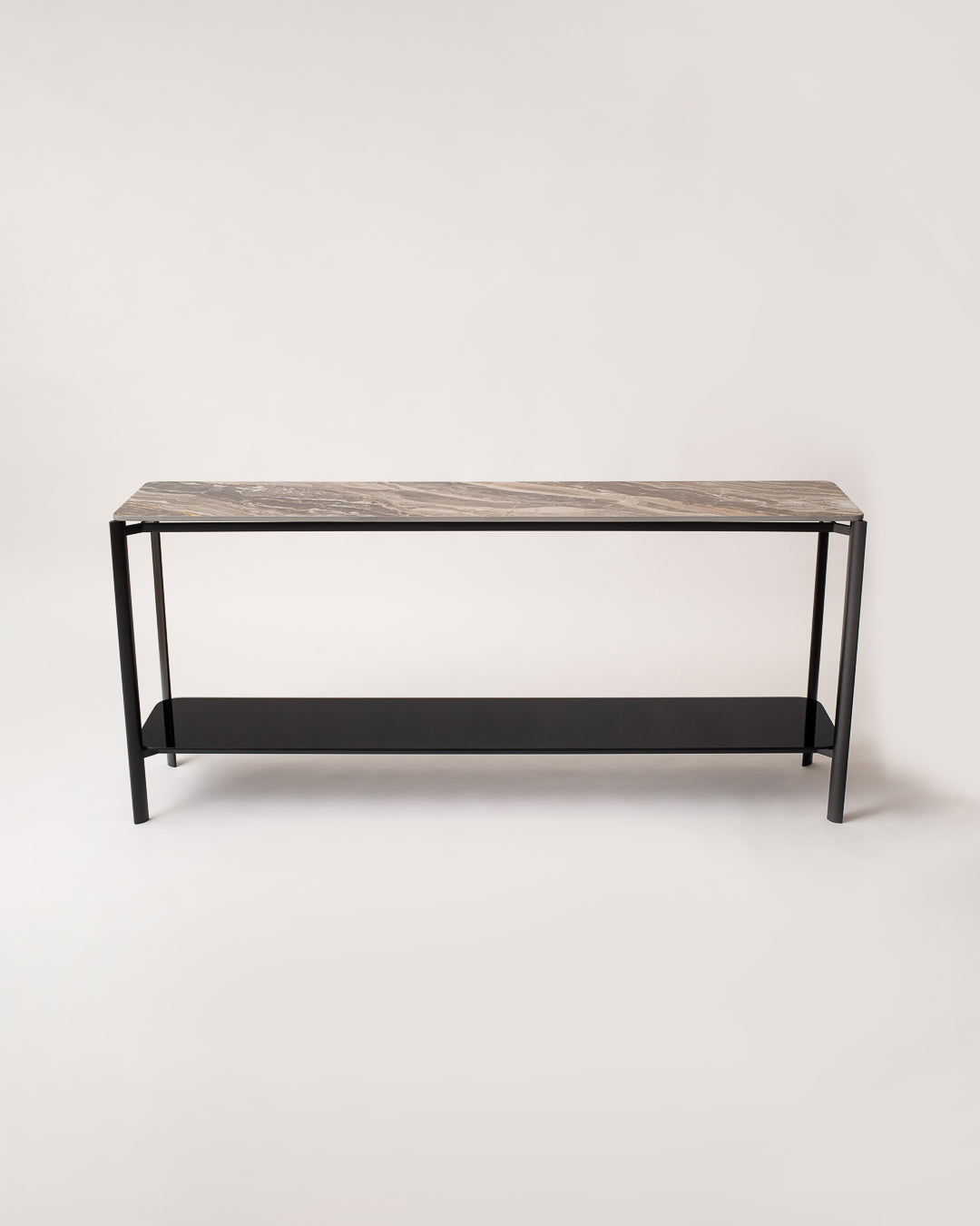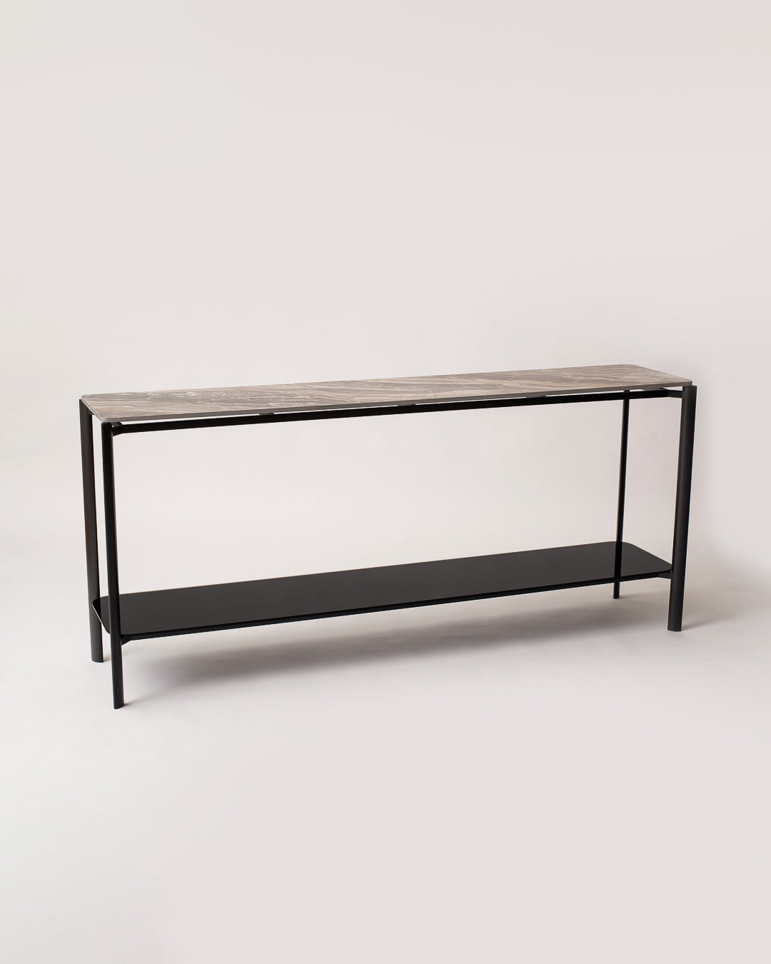La consola Vittoria Nero combina la fuerza atemporal del mármol con la ligereza estructural del metal.