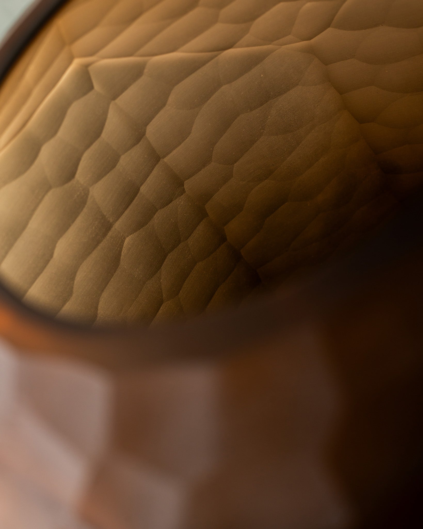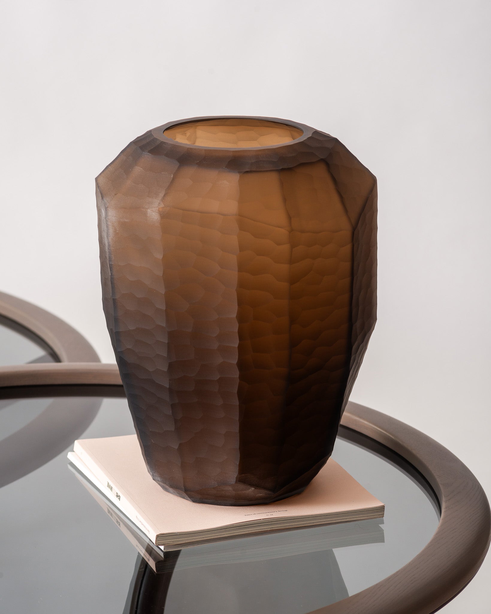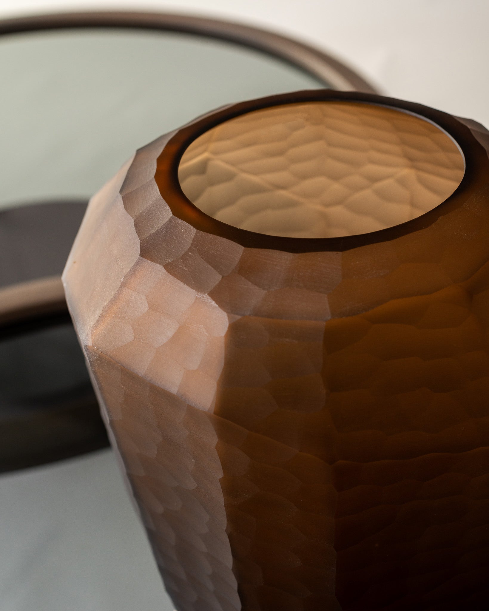 Hexa es un jarrón de vidrio cuya geometría facetada crea un juego sutil de luces y sombras.