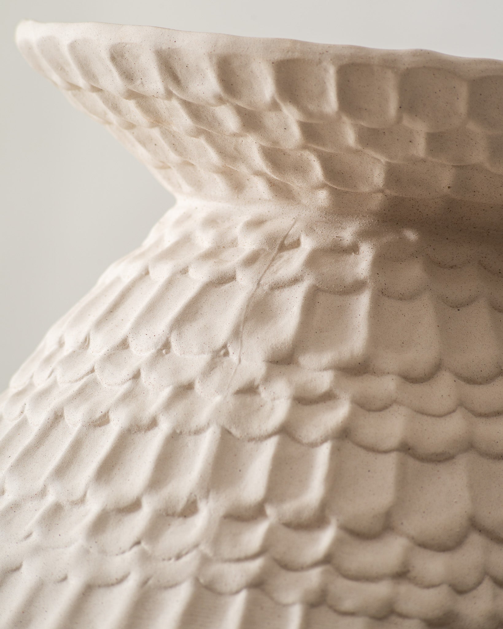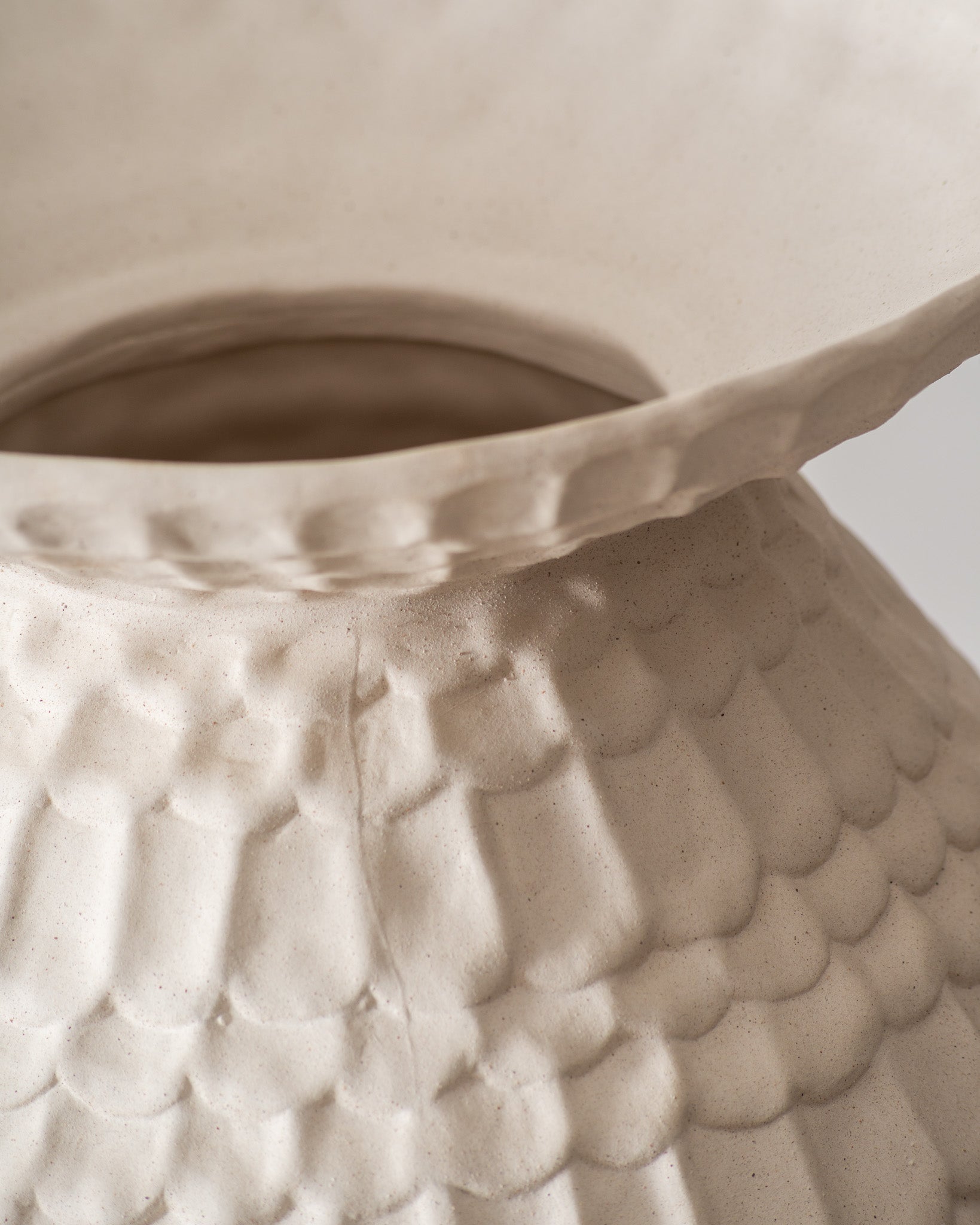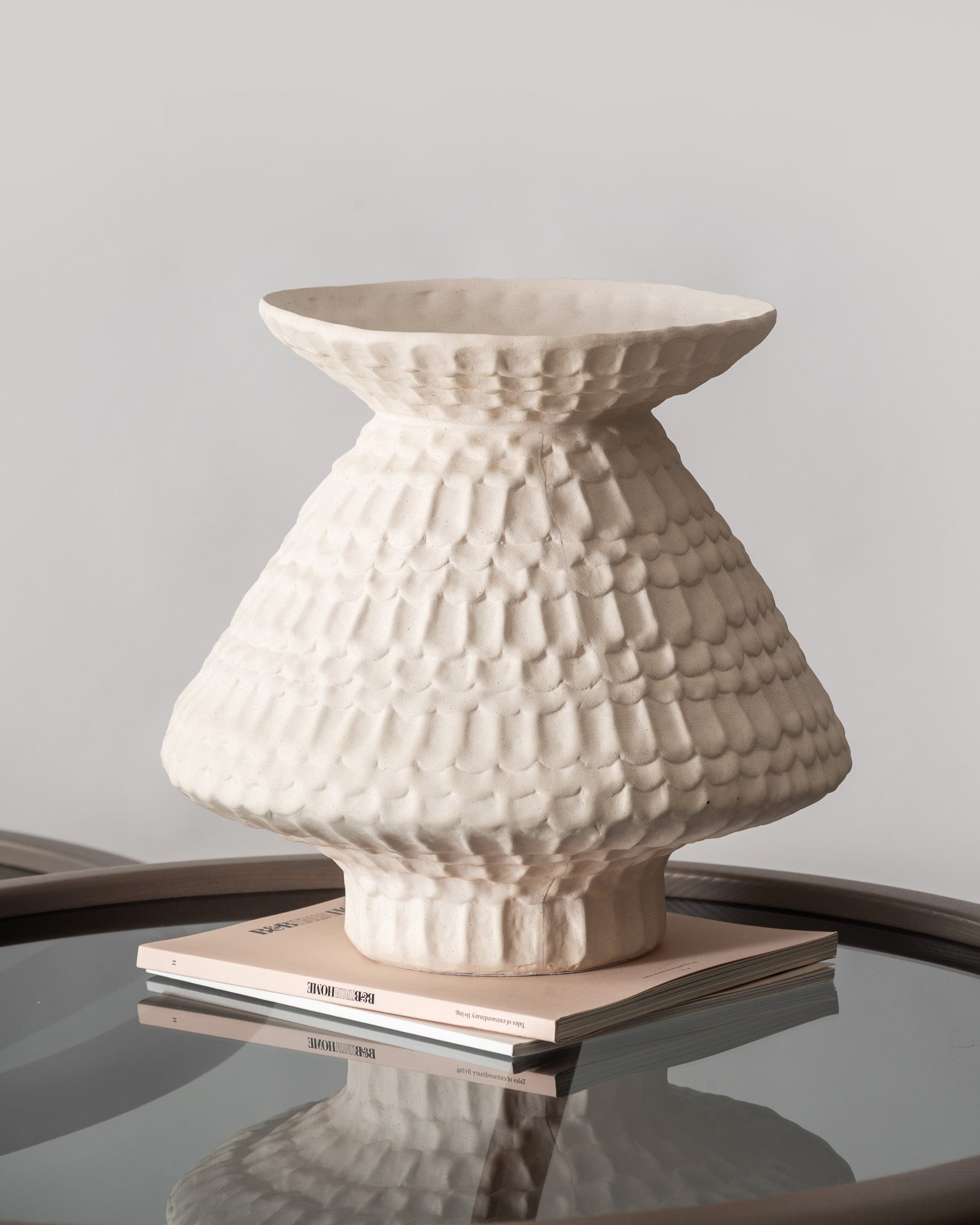 Volterra es un jarrón escultórico y su textura tejida reinterpreta la artesanía clásica con un vuelco contemporáneo.