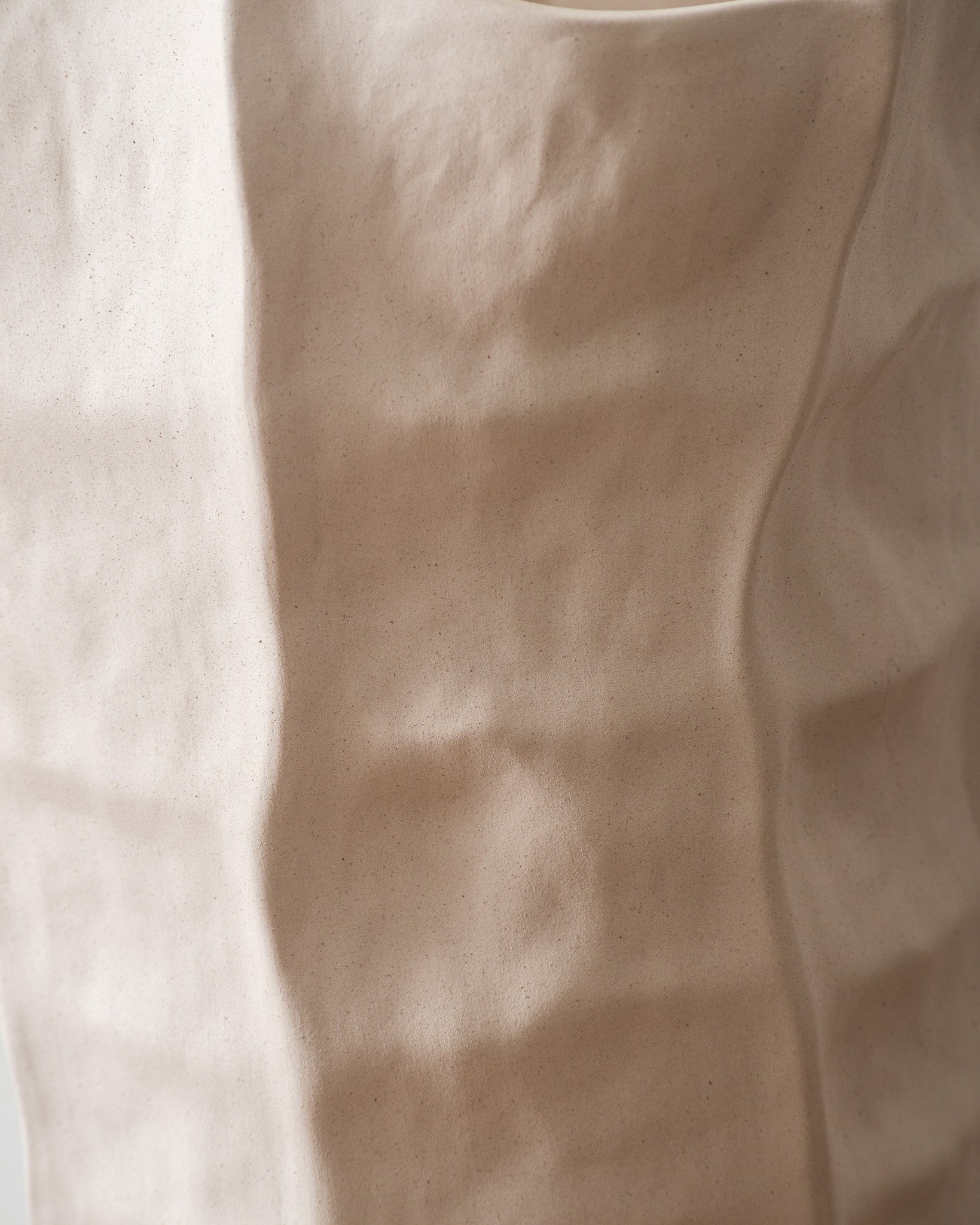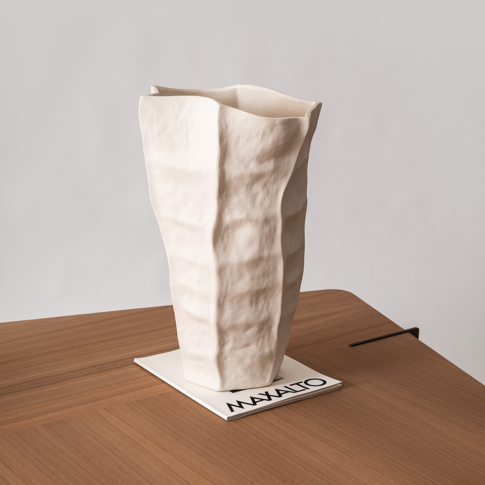 Piega es un jarrón cerámico con pliegues irregulares que simbolizan movimiento contenido.