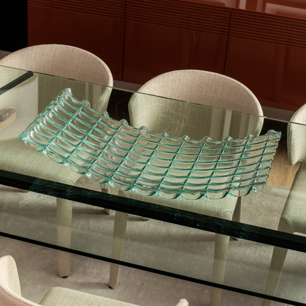 Sorriso es una pieza decorativa en vidrio grueso, de forma ovalada y curvatura sutil, como una sonrisa suspendida.